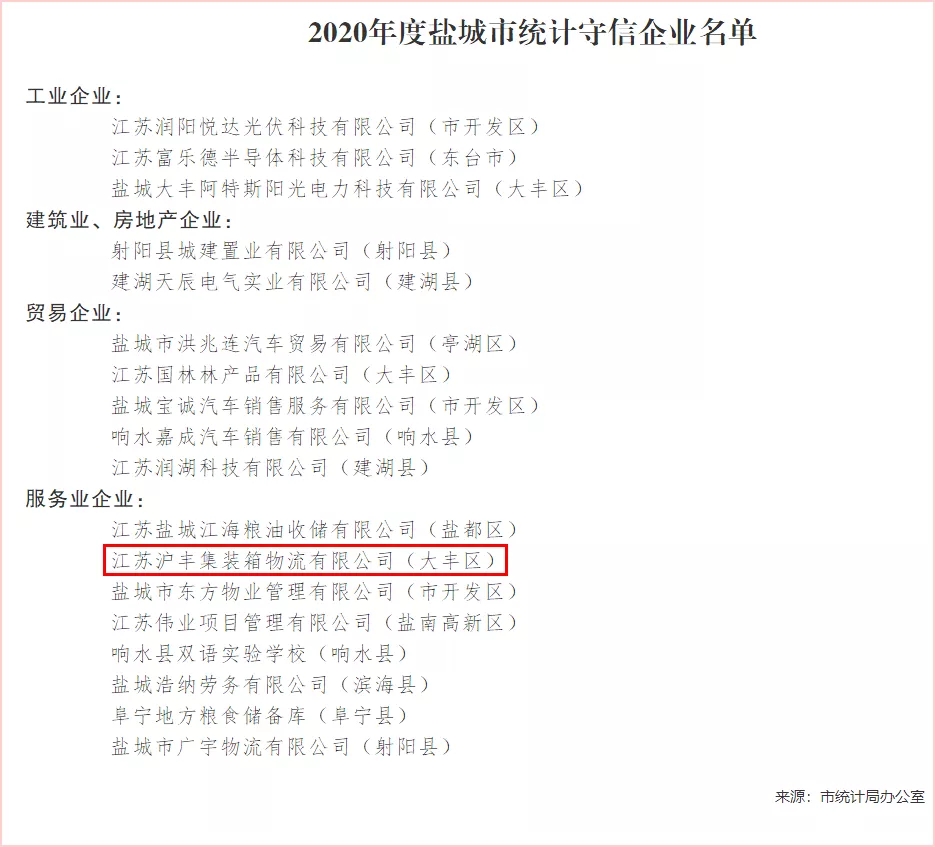 近日,通過嚴格審核,鹽城港滬豐集裝箱公司被鹽城市統計局評為“2020年度統計守信企業”,充分體現了滬豐公司重視和加強誠信管理體系建設所作出的努力,對塑造公司誠信經營形象、提升物流市場競爭力具有重要意義。