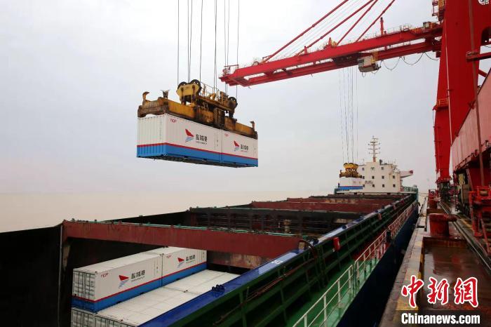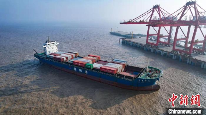 裝載農副產品的貨輪駛向上海。 鹽城港集團供圖