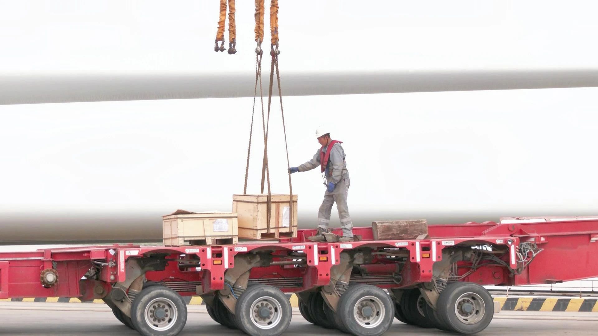 “這批風(fēng)電葉片發(fā)往上海金山,共計(jì)36套,單套長(zhǎng)度達(dá)110米,目前已完成18套的裝載作業(yè),這是第9船次。我們班組正全力協(xié)作,力爭(zhēng)在6小時(shí)內(nèi)完成本船次的裝運(yùn)任務(wù),確保按時(shí)離港。”江蘇鹽城港風(fēng)電裝備進(jìn)出口港有限公司生產(chǎn)組二班班長(zhǎng)祁正磊介紹道。