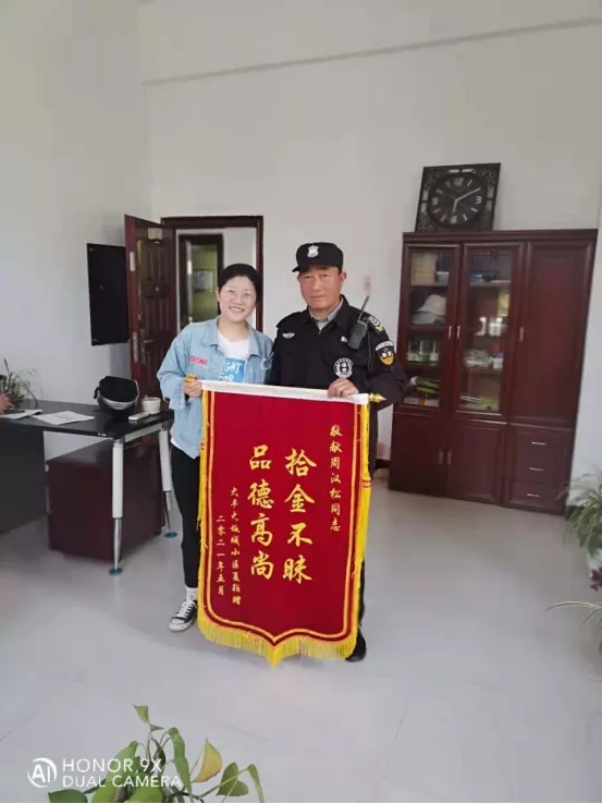 當(dāng)天中午,夏女士來到物業(yè)服務(wù)中心取回手機(jī),對(duì)物業(yè)服務(wù)處的工作人員幫其找回了手機(jī)表示感激,并提出想請(qǐng)周漢松吃飯以示感謝。周漢松婉言謝絕了她的好意,并稱這是其應(yīng)當(dāng)做的,本分之內(nèi)的事。幾天后,夏女士帶著繡有“拾金不昧·品德高尚”的錦旗來到物業(yè)客服中心前臺(tái),以表達(dá)自己對(duì)物業(yè)工作人員的謝意。