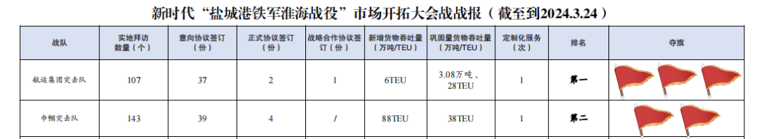 自新時代“鹽城港鐵軍淮海戰(zhàn)役”市場開拓大會戰(zhàn)開展以來,航運集團(tuán)積極響應(yīng)鹽城港集團(tuán)黨委號召,成立航運集團(tuán)突擊隊和巾幗突擊隊,持續(xù)深化攬貨拓源,大力弘揚“鐵軍精神”,成功實現(xiàn)市場開拓“新突破”,將定制化、兜底式服務(wù)推向了“新高度”。截至目前,累計拜訪客戶308家,簽訂意向協(xié)議97份,簽訂正式協(xié)議8份,實現(xiàn)新增營收超100萬元,集裝箱走量1008TEU。根據(jù)新時代“鹽城港鐵軍淮海戰(zhàn)役”指揮部第二期戰(zhàn)報,航運集團(tuán)包攬集體前兩名,個人前三名,全力打響“鹽城港鐵軍淮海戰(zhàn)役”市場開拓大會戰(zhàn)第一槍。