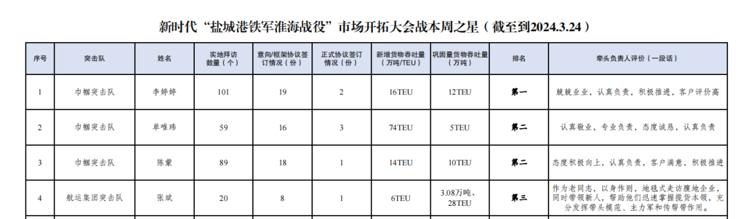 為確保新時代“鹽城港鐵軍淮海戰(zhàn)役”市場開拓大會戰(zhàn)取得實效,航運集團(tuán)突擊隊和巾幗突擊隊堅持“早晨會、晚匯報”工作機(jī)制,全面梳理腹地市場,明確目標(biāo)客戶群體,制定詳細(xì)的市場開拓計劃。同時,強(qiáng)化攬貨人員培訓(xùn),以“戰(zhàn)功第一、全力以赴,令行禁止、使命必達(dá)”的要求,按照“我說你聽、你說我聽,我做你看、你做我看”老帶新模式,通過發(fā)放“流動紅旗”并將“奔牛”“蝸牛”在當(dāng)月績效中予以體現(xiàn)的方式,“比學(xué)趕超,樹立典型”,進(jìn)一步發(fā)揮榜樣力量,不斷提升服務(wù)水平,以“軟實力”助推“硬發(fā)展”。