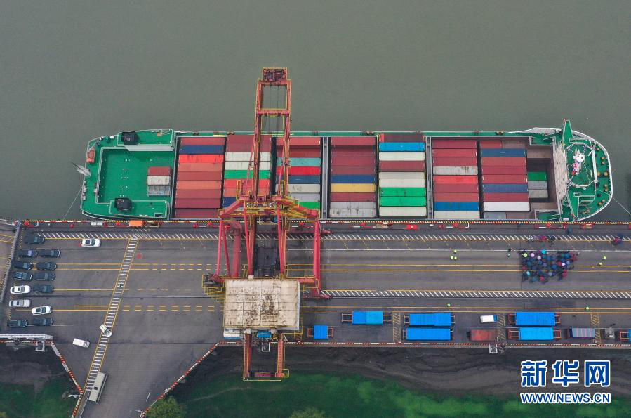 2月28日,??吭诖a頭的“漢海5號”準備首航駛往上海洋山港(無人機照片)。新華社發(趙軍 攝)