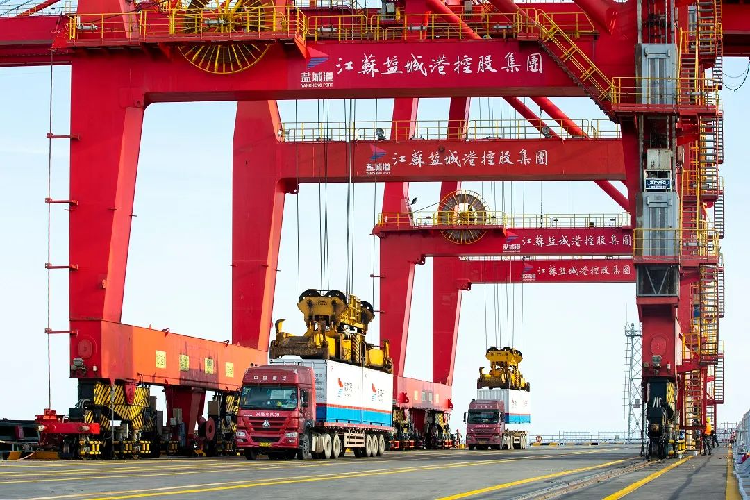 走進鹽城港碼頭,能夠看到一排排的起重機械、吊機正在緊張而忙碌的工作著;在港區(qū)集裝箱堆場,車來車往,一派繁忙景象。