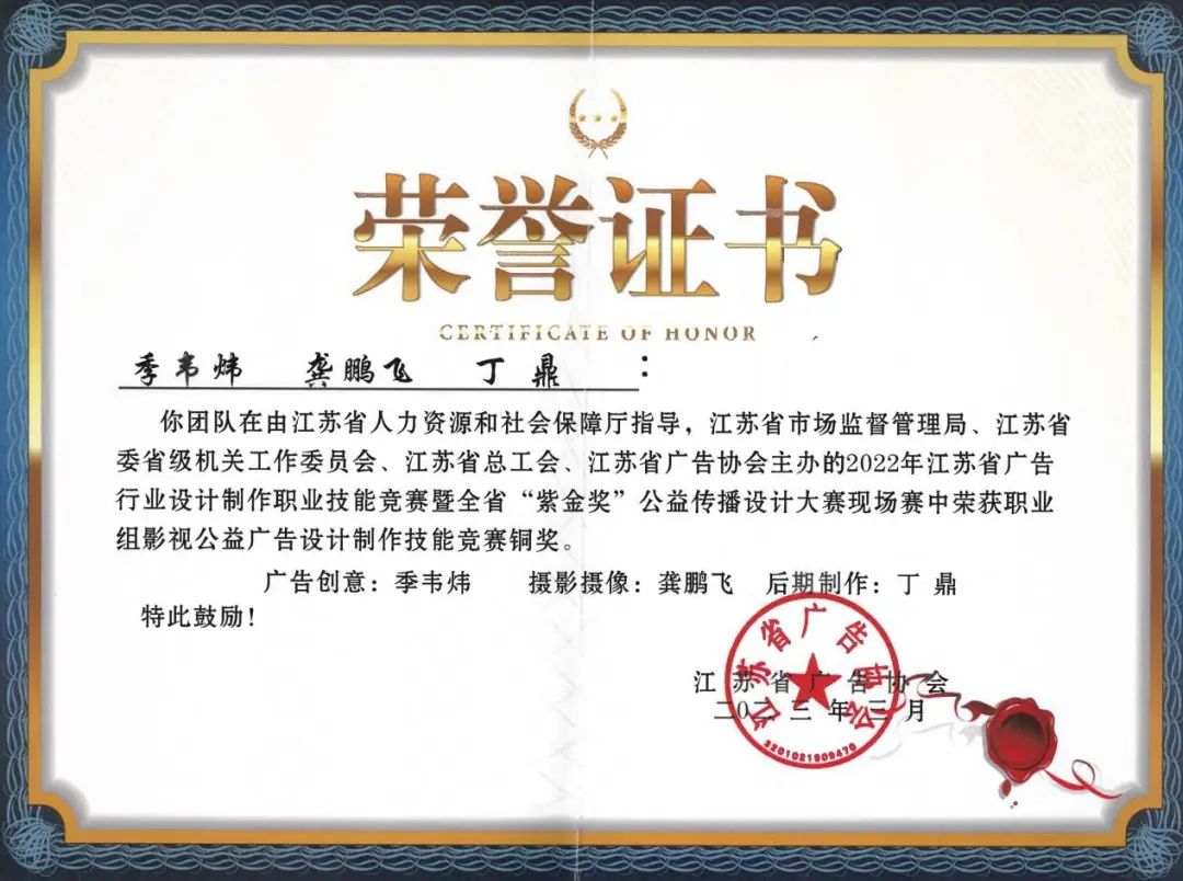 近日,由江蘇省人力資源和社會(huì)保障廳指導(dǎo),江蘇省市場(chǎng)監(jiān)督管理局、江蘇省委省級(jí)機(jī)關(guān)工作委員會(huì)、江蘇省總工會(huì)、江蘇省廣告協(xié)會(huì)主辦的2022年江蘇省廣告行業(yè)設(shè)計(jì)制作職業(yè)技能競(jìng)賽暨全省“紫金獎(jiǎng)”公益?zhèn)鞑ピO(shè)計(jì)大賽在南京圓滿收官。鹽城港文旅集團(tuán)廣告?zhèn)髅椒止緟①悎F(tuán)隊(duì)現(xiàn)場(chǎng)創(chuàng)作的《共圓強(qiáng)國(guó)復(fù)興夢(mèng)》短視頻作品大賽榮獲職業(yè)組影視公益廣告設(shè)計(jì)制作技能競(jìng)賽銅獎(jiǎng)。