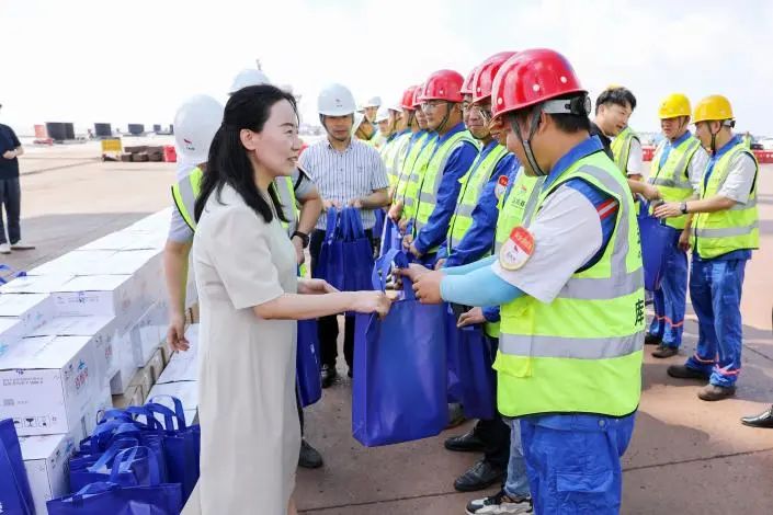 活動(dòng)現(xiàn)場(chǎng),袁欣與大家親切交談,詳細(xì)詢問(wèn)一線職工的工作狀態(tài)和實(shí)際需求,對(duì)他們頂烈日、戰(zhàn)酷暑,始終堅(jiān)守崗位的敬業(yè)精神表示衷心感謝,叮囑他們要注意防暑降溫,做好個(gè)人防護(hù),并將防暑降溫“清涼禮包”送到職工代表手上。她說(shuō),當(dāng)前高溫、惡劣天氣逐漸增多,各單位要切實(shí)做好夏季防暑降溫工作,動(dòng)態(tài)調(diào)整作業(yè)時(shí)間,為廣大員工提供清涼舒心的休息場(chǎng)所,全面保障人身安全。同時(shí),要時(shí)刻繃緊安全這根弦,聚焦生產(chǎn)、消防重點(diǎn)領(lǐng)域,常態(tài)化開展安全隱患排查治理工作,做好值班值守和應(yīng)急處置,確保港區(qū)安全生產(chǎn)形勢(shì)穩(wěn)定。