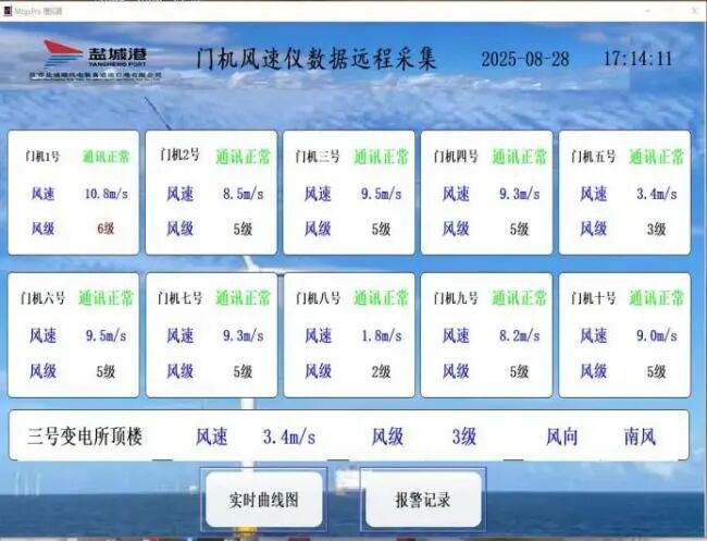 以往,門機實時風速數據僅能在司機室查看,值班室調度人員、現場管理人員無法同步獲取,存在信息滯后導致的安全風險。通過加裝高精度風速傳感器,搭配低延遲無線傳輸模塊,將風速數據實時推送至值班室監控大屏與管理人員手機客戶端,數據傳輸延遲控制在3秒以內。不僅避免了人工登高查看風速的安全隱患,更降低了因風速突變導致的設備損壞、貨物損耗風險,顯著提升港口安全智能化管理水平。