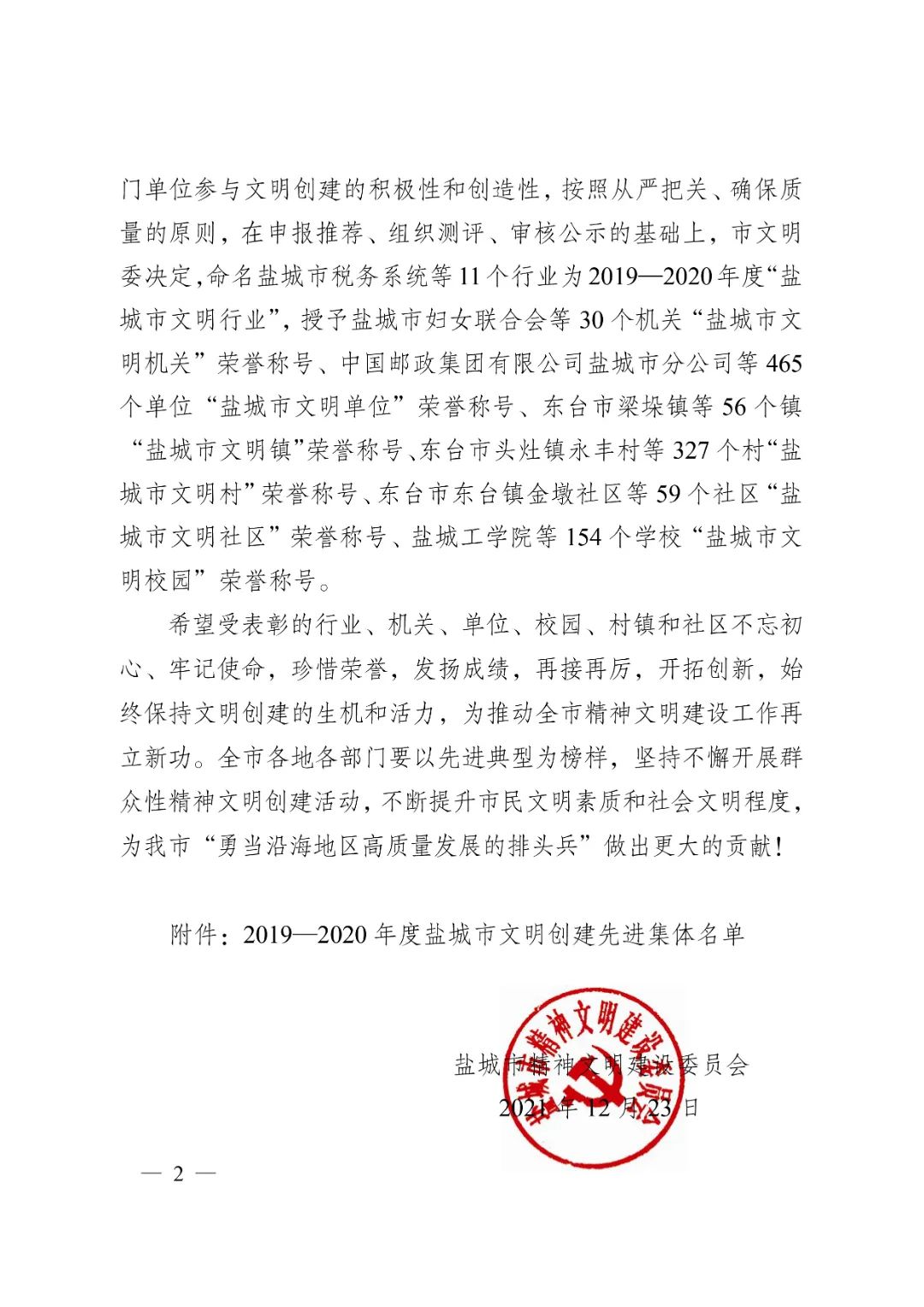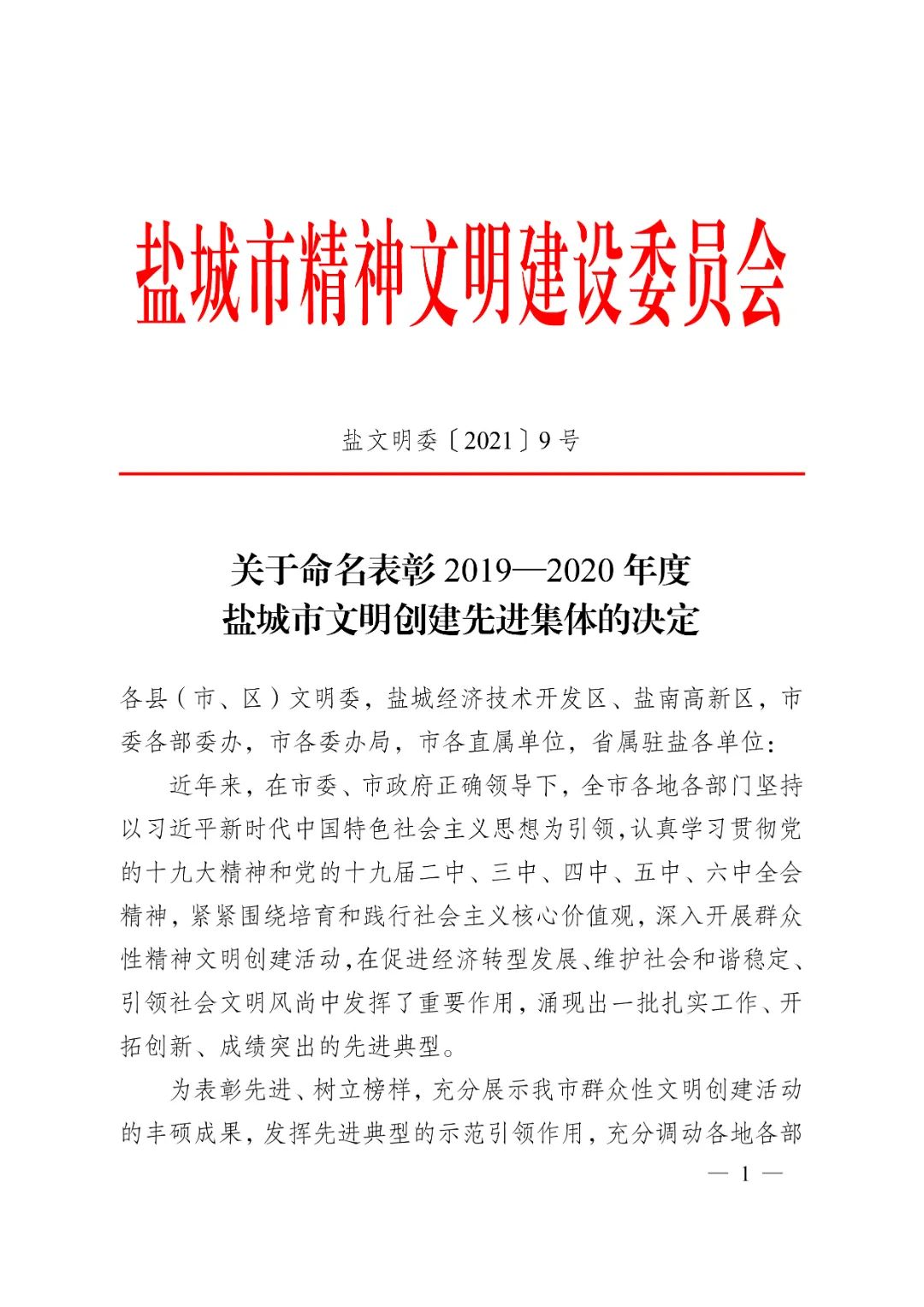 12月23日,鹽城市精神文明建設(shè)委員會發(fā)布《關(guān)于命名表彰2019-2020年度鹽城市文明創(chuàng)建先進(jìn)集體的決定》,集團(tuán)榮獲2019-2020年度“鹽城市文明單位”榮譽(yù)稱號。