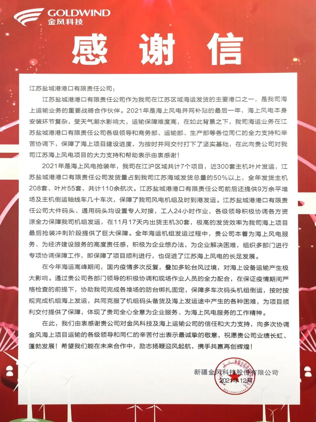 金風(fēng)科技是鹽城港大豐港區(qū)風(fēng)電產(chǎn)業(yè)的重要合作伙伴,根據(jù)協(xié)議,雙方將在2022年圍繞風(fēng)電設(shè)備內(nèi)外貿(mào)易等領(lǐng)域開展合作,進(jìn)一步助力集團(tuán)特色風(fēng)電產(chǎn)業(yè)港發(fā)展邁向新格局。