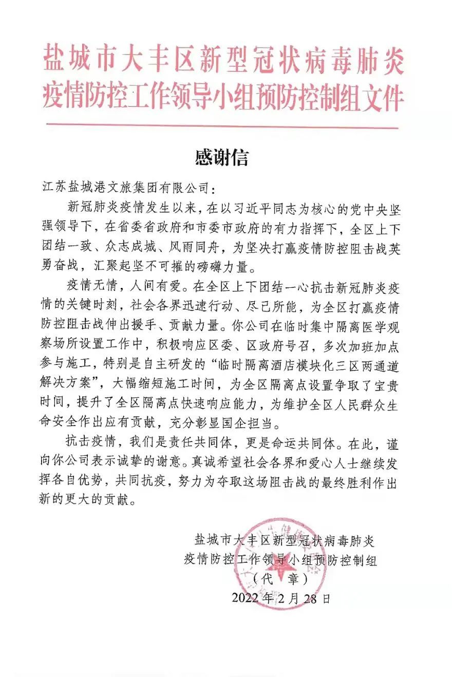 3月1日,大豐區(qū)疫情防控工作領(lǐng)導(dǎo)小組向鹽城港文旅集團(tuán)發(fā)來感謝信,對(duì)文旅集團(tuán)在設(shè)置隔疫情隔離點(diǎn)工作中,自主研發(fā)“臨時(shí)集中隔離醫(yī)學(xué)觀察場(chǎng)所模塊化‘三區(qū)’解決方案”,提升全區(qū)隔離點(diǎn)快速響應(yīng)能力所作出的貢獻(xiàn)表示感謝。