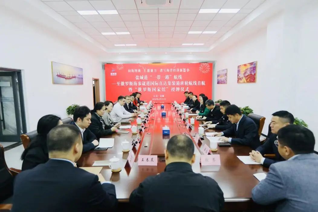 4月21日,鹽城港“一帶一路”航線—至俄羅斯海參崴港國際直達集裝箱班輪航線首航暨“俄羅斯國家館”授牌儀式成功舉行。鹽城港集團副總經理袁欣,俄羅斯聯邦政府經濟發展部、農業部俄羅斯出口中心國家館負責人羅曼諾夫·伊利亞·安德烈維奇,俄羅斯聯邦政府自然資源和生態部鎳礦出口負責人科里尼卡夫·葉甫蓋尼·斯捷巴諾維奇,鹽城大豐海事處處長朱龍錦,鹽城海關駐大豐港辦事處副主任朱天樂,鹽城出入境邊防檢查站邊檢處副處長張偉,海鐵聯捷公司海運事業部總監蒯霞、香港公司經理楊森,江蘇俄貨寶國際物流公司執行董事史素華出席活動。鹽城港航運集團、大豐港開發集團、保稅物流中心、糧食物流園相關負責同志等參加。