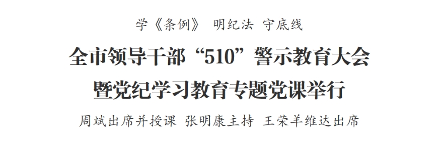 5月10日,全市領(lǐng)導(dǎo)干部“510”警示教育大會(huì)暨黨紀(jì)學(xué)習(xí)教育專(zhuān)題黨課舉行,深入學(xué)習(xí)習(xí)近平總書(shū)記關(guān)于黨的自我革命的重要思想,全面落實(shí)黨中央和省市委關(guān)于黨紀(jì)學(xué)習(xí)教育的部署要求,深化以案為鑒、以案明紀(jì)、以案促改,推動(dòng)全市黨員干部和公職人員認(rèn)真學(xué)習(xí)《中國(guó)共產(chǎn)黨紀(jì)律處分條例》,真正做到學(xué)紀(jì)、知紀(jì)、明紀(jì)、守紀(jì),為推進(jìn)中國(guó)式現(xiàn)代化鹽城新實(shí)踐提供堅(jiān)強(qiáng)紀(jì)律保障。市委書(shū)記周斌出席并講授黨紀(jì)學(xué)習(xí)教育專(zhuān)題黨課。市委副書(shū)記、市長(zhǎng)張明康主持,市人大常委會(huì)主任王榮、市政協(xié)主席羊維達(dá)出席。