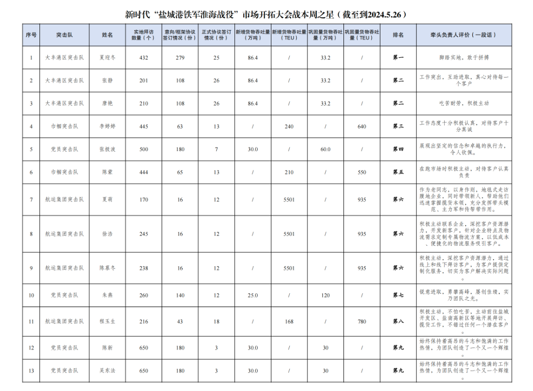 第一名:大豐港區(qū)突擊隊 夏迎冬(拜訪客戶432家,簽訂意向協(xié)議279份,簽訂正式協(xié)議25份,新增貨物吞吐量86.4萬噸,鞏固量貨物吞吐量33.2萬噸);