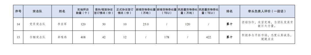 3.簽訂正式協(xié)議數(shù)量427份:其中大豐港區(qū)突擊隊46份,射陽港區(qū)突擊隊43份,濱海港區(qū)突擊隊42份,航運集團(tuán)突擊隊40份,建湖港區(qū)突擊隊40份,亭湖港區(qū)突擊隊40份,青年突擊隊31份,巾幗突擊隊30份,黨員突擊隊27份,響水港區(qū)突擊隊25份,多式聯(lián)運第二突擊隊25份,多式聯(lián)運第一突擊隊20份,阜寧港區(qū)突擊隊18份。